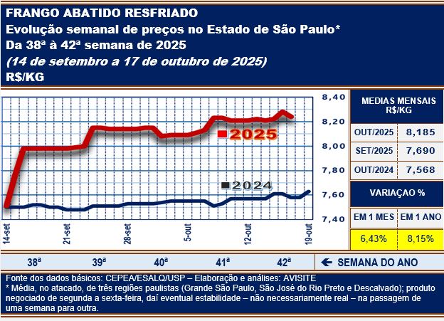 Desempenho do frango abatido na 42ª semana de 2025, terceira do mês de outubro Este conteúdo está disponível no site e pode ser lido na íntegra acessando o link abaixo. Leia mais em: https://www.av